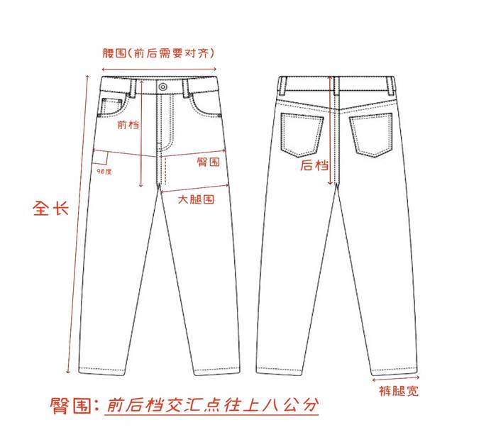 为确保数据准确性,请以惯穿之合身裤子进行平铺测量